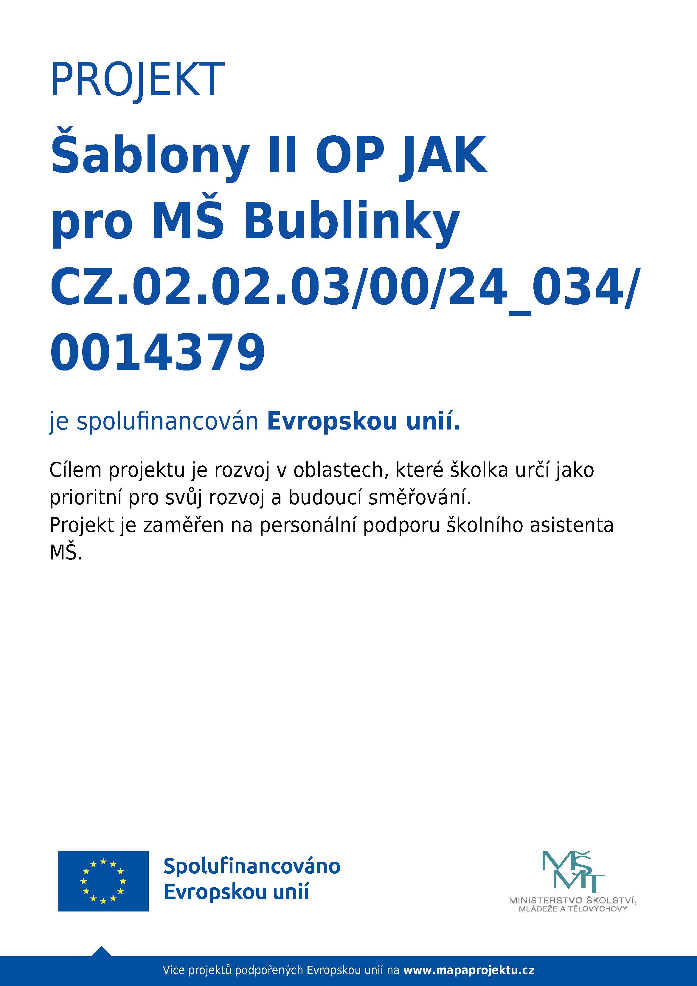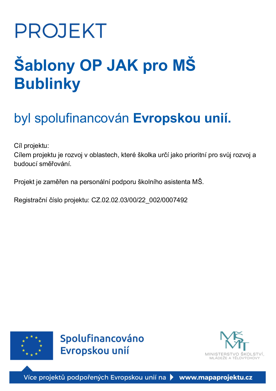 - Anglický jazyk - postupné přirozené osvojení slovní zásoby v návaznosti na daná témata. Cílem je, aby dítě získalo pozitivní vztah k cizímu jazyku, získalo rozsáhlejší slovní zásobu, rozumělo anglickým výrazům a domluvilo se v základních jednoduchých větách. Anglický jazyk je zakomponován rodilou mluvčí z USA do všech aktivit režimu školky - písničky, hry, tanec, tvoření, procházky a pobyt venku.